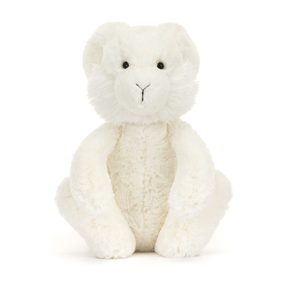 Cloudy with a chance of sweetness – that's Arlo Hare! This snowy hare has long, chunky ears with contrast black tips and inner shapers. With huge beany paws, chubby, tufty cheeks, a stitch-detail nose and snow-soft fur, this long-legged hare will bound off with your heart.